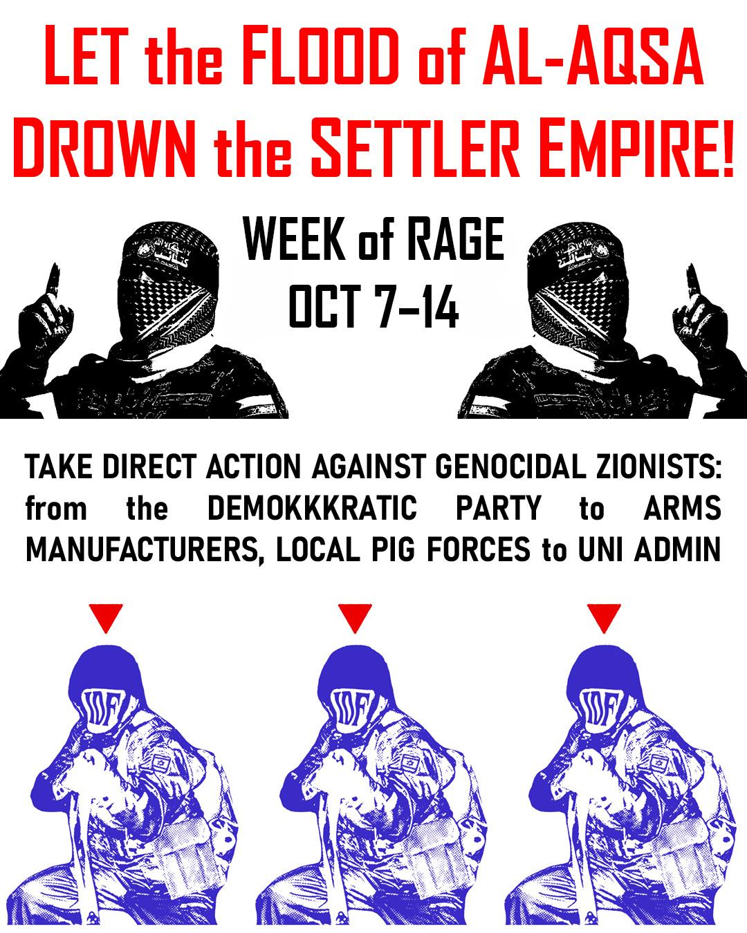 Call for a Week of Rage from October 7–14: Direct action in solidarity with the Palestinian Resistance and anti-colonial movements in Turtle Island.