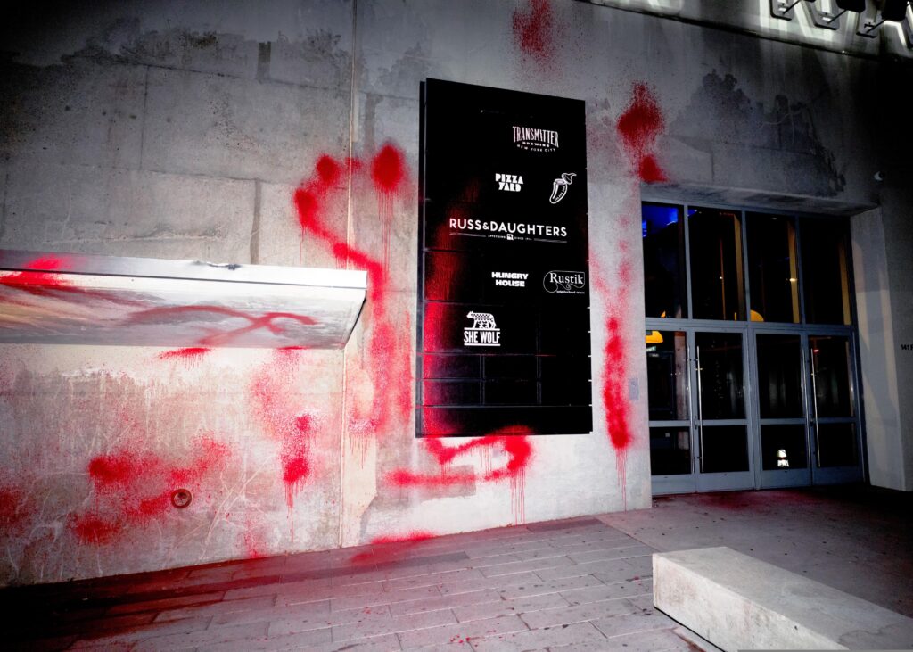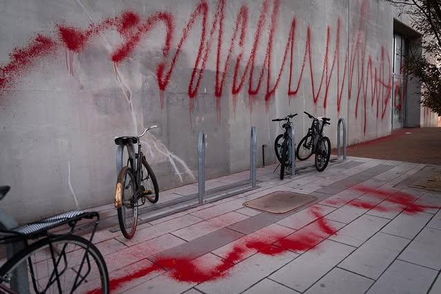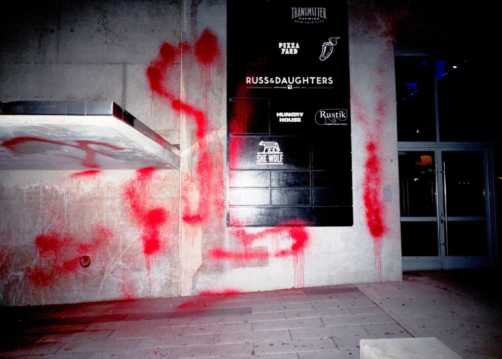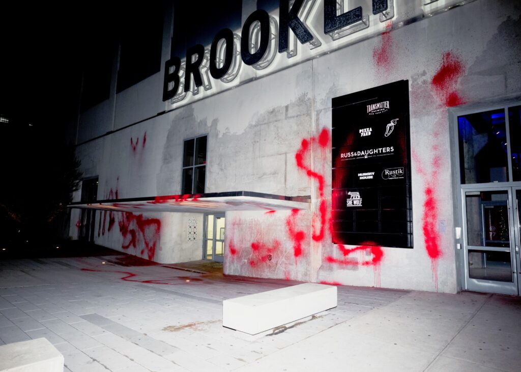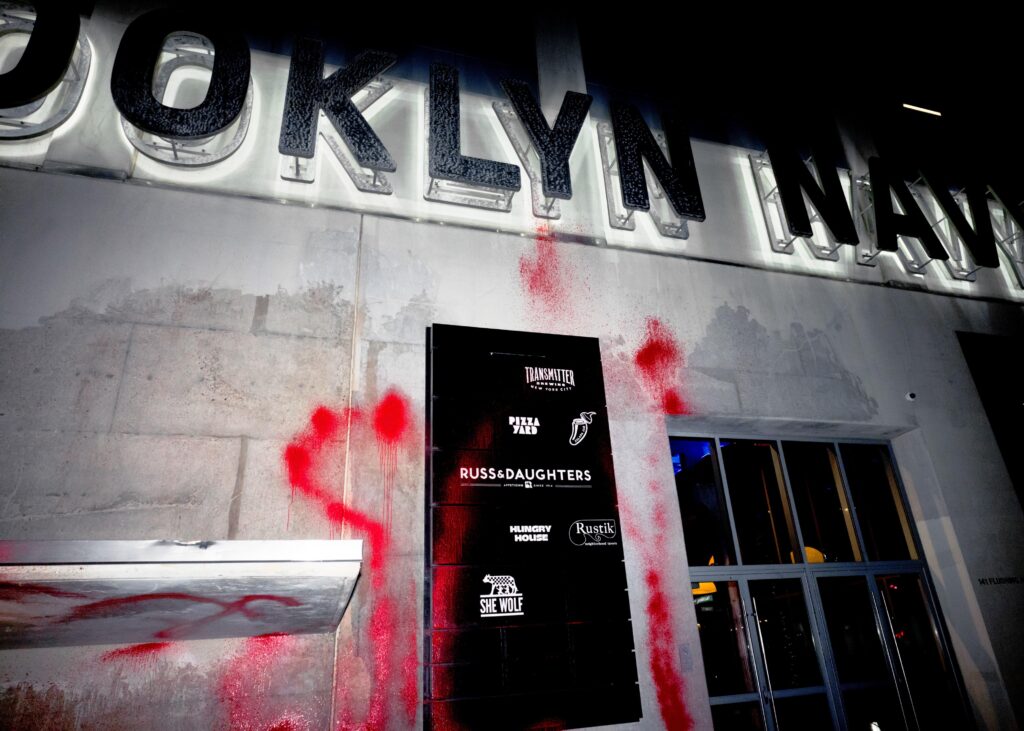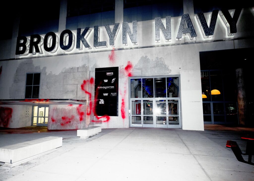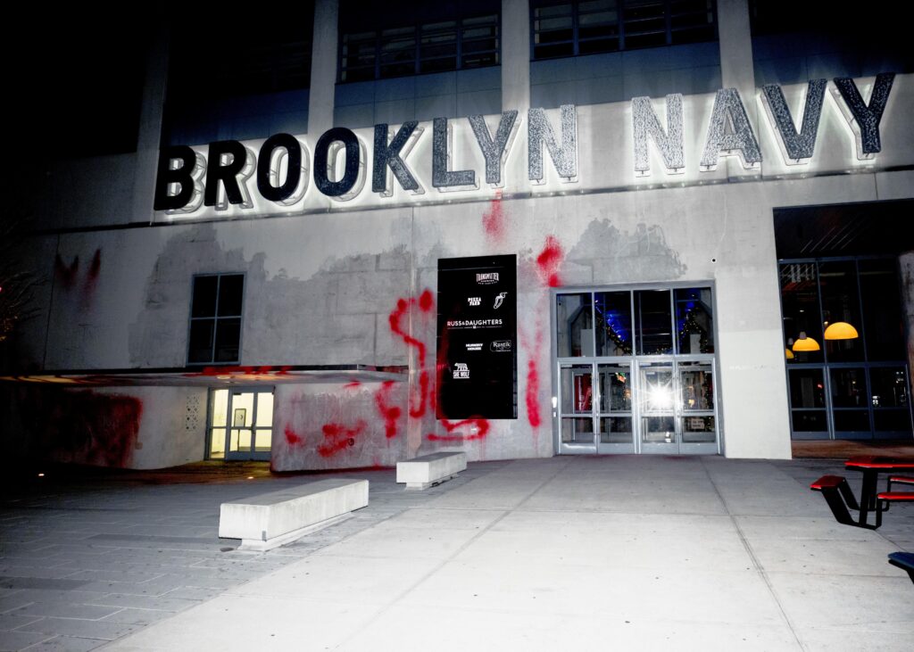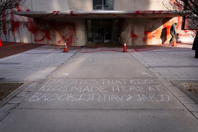 Brooklyn Navy Yard has been redecorated for the 4th time this year. Decorators visited late on Tuesday night, the 38th anniversary of the First Intifada, which was the night before the December 10 board meeting, and @demilitarizebklynnavyyard’s weekly picket and noise demo.