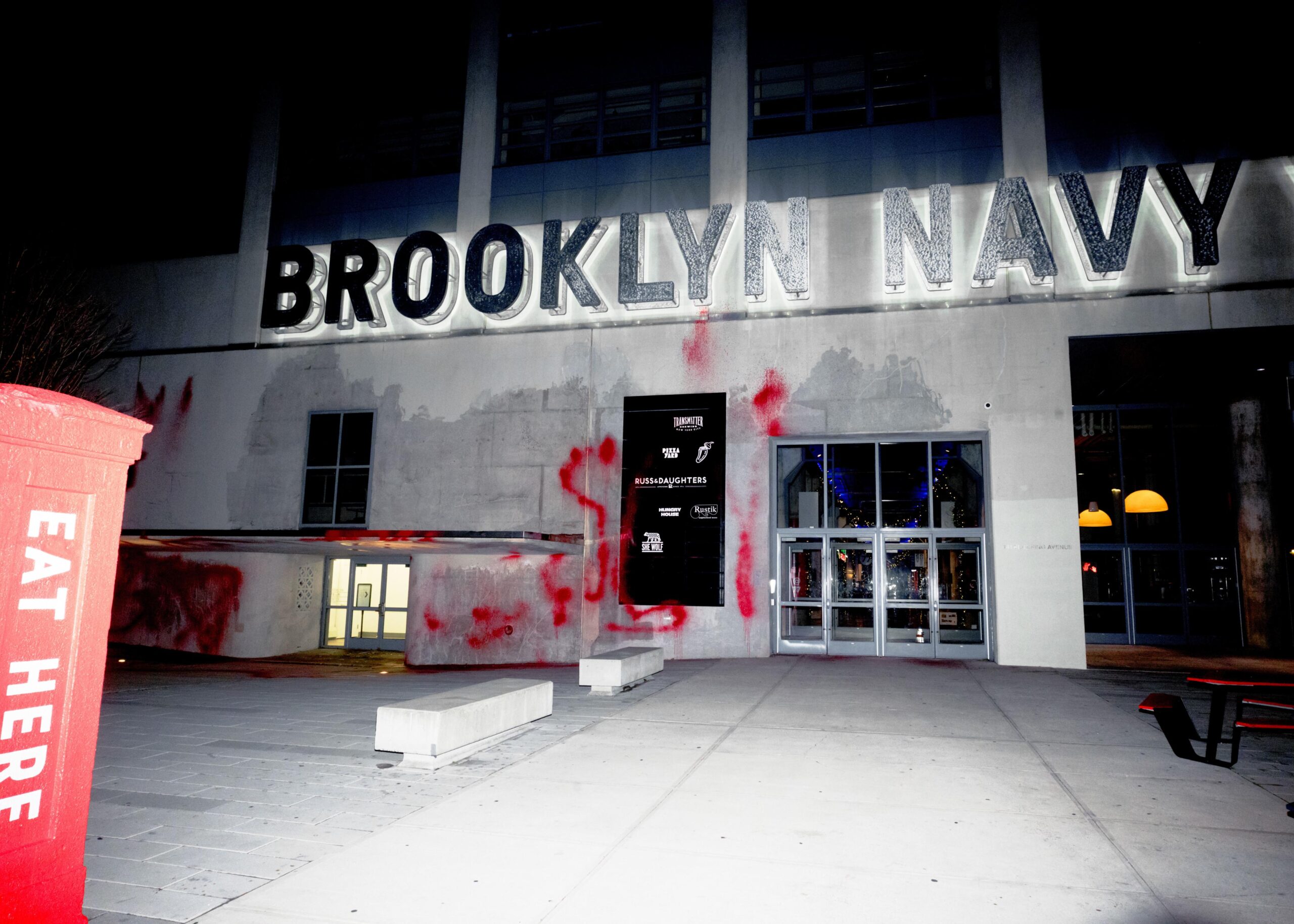 Brooklyn Navy Yard has been redecorated for the 4th time this year. Decorators visited late on Tuesday night, the 38th anniversary of the First Intifada, which was the night before the December 10 board meeting, and @demilitarizebklynnavyyard’s weekly picket and noise demo.